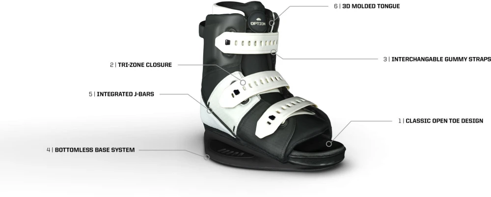 Der Option-Boot verbindet High-End-Design mit perfekter Funktionalität für Einsteiger und einem sensationellen Preis-Leistungsverhältnis. Zudem kann er dank des Open-Toe-Konzepts von mehreren Fahrern geteilt werden, die eine ähnliche Schuhgröße haben. Das Gummy-Strap-Verschlusssystem bietet höchsten Komfort, sowie die selbe Performance und den Support unserer Closed-Toe-Boots.